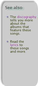 Audio Clips and Audio InterviewsThis area contains a slew of song samples to whet your appetite. (There are no complete songs here... can you say copyright infringement?) You'll also find several audio interviews here. Use the sublinks on the left to view the audio pages. How to listen to audio clips and interviewsAudio files are currently in RealAudio format (but will be converted to MP3 at some point). To listen to a RealAudio file, you'll need the RealPlayer or an appropriate plug-in for another player. Please let me know if you need help with the audio clips or encounter problems with them.